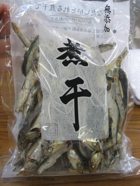 According to my electronic dictionary, niboshi are “small dried crunchy sardines”. But unlike the tiny little fishies in “nuts and fish”, these puppies here are about 2 inches long and incredibly tough. In fact, I bought them under the impression that they were a snack food, and I was eating them, head and all, but they weren’t very tasty for some reason. And then I read the package. Apparently, they’re really supposed to be used for soup stock–you boil ’em, drain ’em, and toss ’em. Or, if you do eat ’em as-is, you’re supposed to remove the head and the insides, and “watch out for the bones.” Forget it–too much work. These puppies had a date with the garbage can last week. ![]()