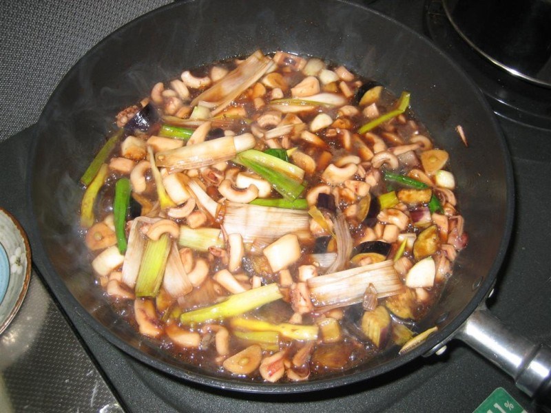 Granted, it was a bit more work than just buying prepared squid–I learned more about squid anatomy than I cared to know–but once it was in little chunks, and made friends with some eggplant, leeks, and garlic, it made a very tasty dish. Yum!