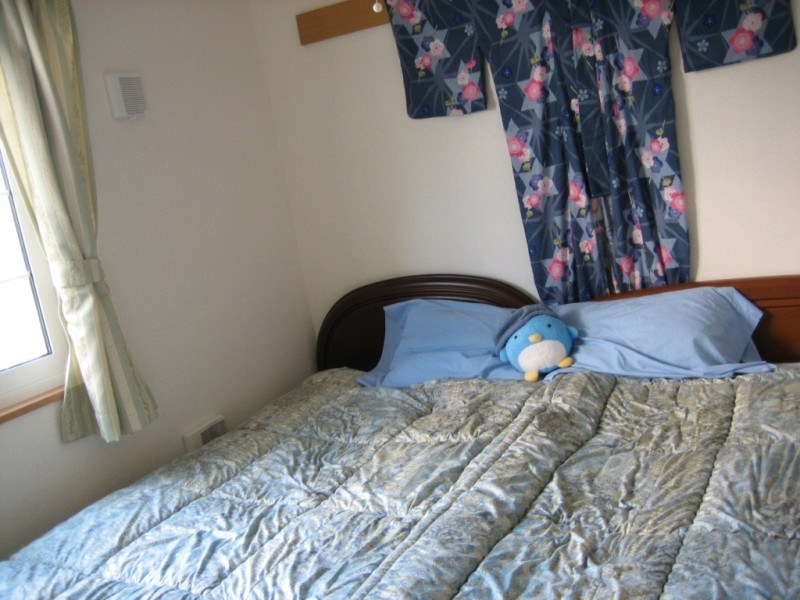 Let’s peek in the bedroom really quickly too while we’re in the back part of the apartment. The bedroom is probably designed for a couple who sleeps on futons (fold up matresses that can be stowed away during the daytime). We however, have two twin beds which we’ve managed to rig together with some added padding on top to create a very comfortable king-size bed which fills the WHOLE ROOM — It’s virtually impossible to fall out of bed!