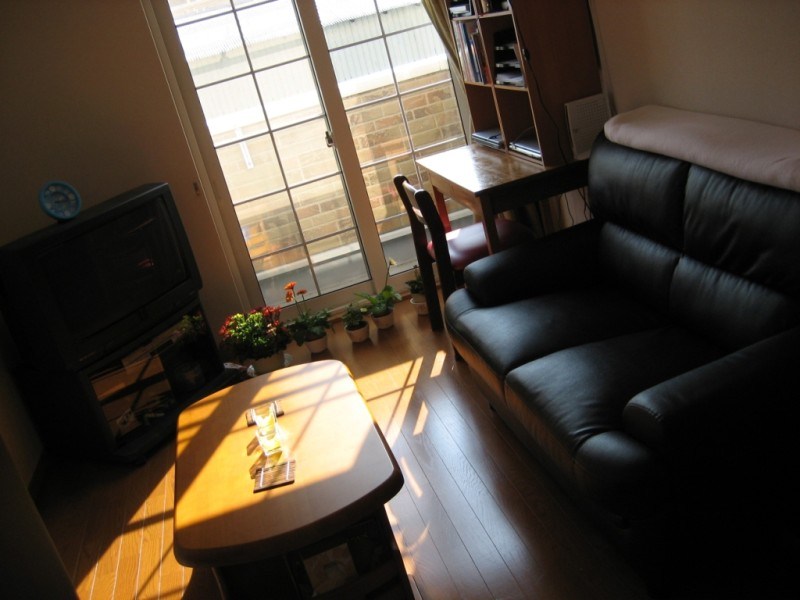 Well now that you’ve gotten the basic tour, let’s retire to the living room to relax and chat a little more. This is the room where we often hang out, surf the web, watch TV or entertain guests. It also houses our clothes dresser (not shown, on the left), which for potentially obvious reasons, cannot fit in our bedroom. You’ll notice the view off of our little front porch is not particularly spectacular (just some neighbor’s garages), but the sliding doors do let through some spectacular sunlight, which is wonderful as the days get colder! Here — have a seat on the couch — and how about a refill on that green tea? Try a couple of senbei (Japanese rice crackers, seasoned with soy sauce flavoring).