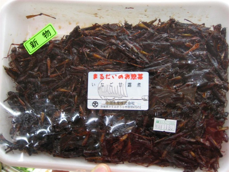 And lastly, this is probably the grossest food I’ve ever found here in Japan. I haven’t even eaten it yet–I just saw it in the store and got blown away that they actually sell this!!! Yes, this is a package of crickets –sweetened, cooked little crickets. I can’t imagine that someone would actually pay over $11 a pound for something like this. And yet, I’m somehow strangely attracted… Maybe they’d be good mixed with something else. Unless someone I know actually shows me what to do with ’em, though, I think they’ll just stay there on the supermarket shelves.
