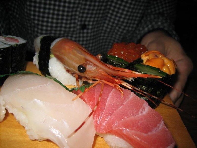 Sushi lovers, feast your eyes on this! Fresh squid, tuna, sea urchin, and fish eggs, and to top it all off, a whole, raw super-jumbo shrimp. This was some seriously good sushi–my mouth is watering just looking at this picture. Yum!!! [Note: We’ve been to this sushi place 3 times now, and we’ve got a great relationship with the couple who owns the place. They’re really talkative, and although we don’t understand most of what they’re saying, it’s always a lot of fun. Plus, their sushi is awesome!]