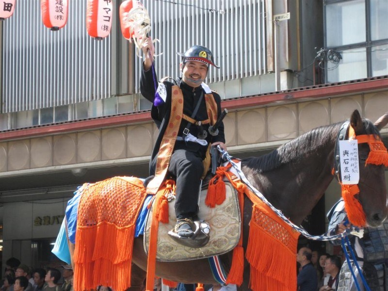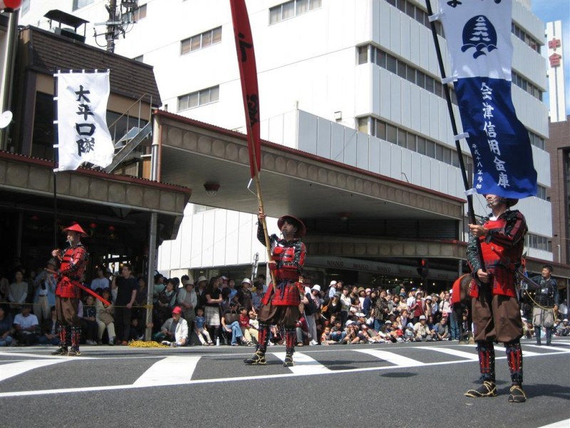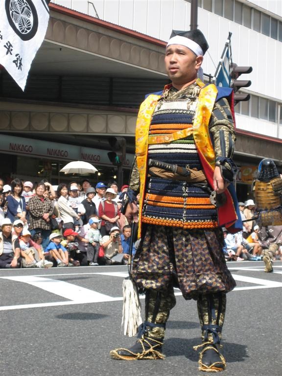 Last Saturday (9/23), our employers arranged for us to be taken to the annual Samurai Parade in Aizu. Back in the states, lots of people love to relive the glory of the medieval days (you know, knights in shining armor and swords and fake English accents and all that). So they have Renaissance festivals and go to SCA meetings and wear leather tunics and read Lord of the Rings and drink ale from pewter mugs and eat turkey legs by the dozen and, in doing so, profoundly amuse the rest of the population at large.