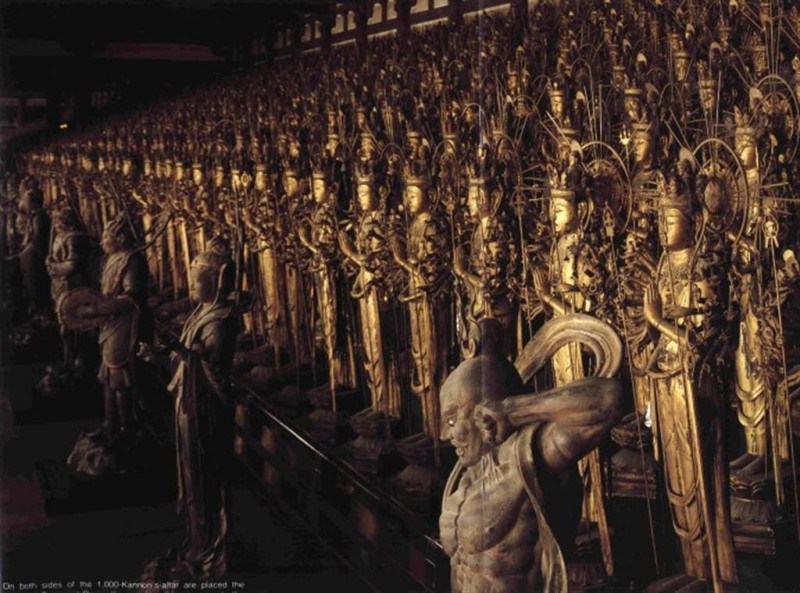 On our last day in Kyoto, viewed the 1001 statues of Kannon, the Buddhist goddess of mercy, at “Sanjyuusangendou” temple. At first, I was pretty amazed by the statues — how impressive they were in their vast, uniform array. Crafted by many different artisans over a period of a couple hundred years, they were collected into a single worship site at this temple. We discovered as we walked through the temple, that those who wish can offer money to the goddess, burn candles as a sacrifice, or purchase a slat of wood on which to write a prayer. The temple staff then burns your slat before the dieties for you, assuring that your prayer will be heard. Below is a picture of a portion of the display:
