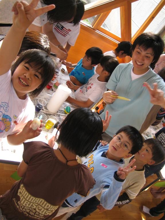 The Easter eggs were a big hit as well. Here’s another of our good friends, Ryo, dyeing eggs and goofing around with the kids at his table. (Incidentally, a co-worker who didn’t come to this event asked me why Easter eggs were associated with Easter. I told him that an egg has a new life in it, and just as a chick will burst out of the shell of the egg and emerge as a new life, Jesus burst the bonds of the grave and emerged in newness of life. Of course, I said all this in Japanese, so it wasn’t nearly as eloquent, but still, what a great symbol for Easter!)