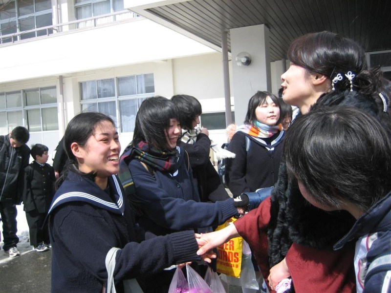After the ceremony, we formed a recieving line outside the school doors (in the below-freezing, windy weather!) to see the now-graduated 3rd-year students off. That was a really nice time of closure for me; I got to shake hands with each one of them and tell them “Omedetou” (“congratulations”) from the heart. I’ve never seen them so happy before—not like that, and not all at the same time. Everybody was all smiles: