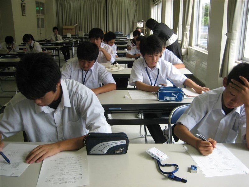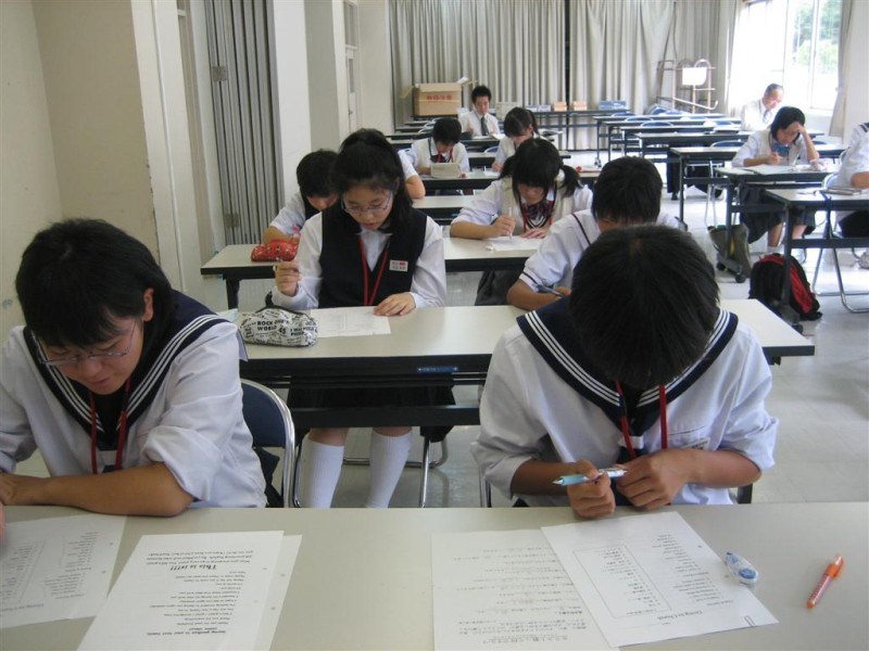 And actually, on that note, today also marked one of the best opportunities we’ve had since we’ve been here to share the gospel with some of our students . There is a group of 20 junior high-school kids from Tamura city that will be going to Mansfield, Ohio for 10 days as part of an exchange program. They have been taking special orientation sessions taught by us English teachers for the past 2 months, and today, Jen and I taught the last orientation session, part of which was about “church in America”. Talk about a great opportinity to share the gospel! Mike took the opportunity to make up a worksheet in Japanese all about the fundamentals of what the Bible teaches, complete with blanks that the students had to fill in. He also made up a worksheet where they had to match basic English church terminology (like “Praying to God” or “Hymn”) with the Japanese meaning.