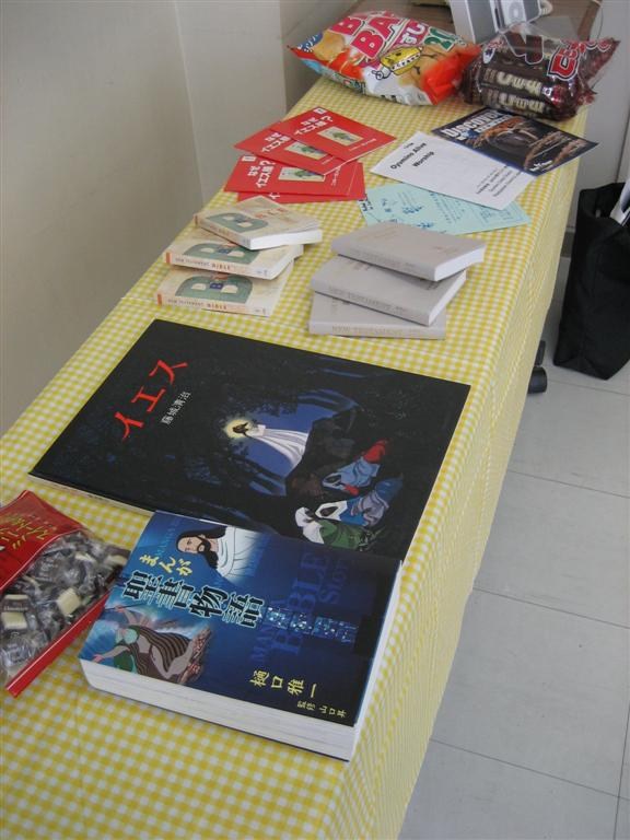 As we expected, they were by-and large clueless about the basics of Christianity. So in all likelihood, all 20 of them heard the following message (in their heart language) for the first time: God is holy, but people are not, and so people are separated from God. But God loved the world, and sent Jesus Christ, who was hung on a cross. He takes our sin and gives us a pure heart in return. He arose from the dead three days later, and so those who believe in him have new life, and will go to heaven when they die. We also had a snack/resource table during the break time, complete with a manga Bible, an art-picture book of Jesus, gospel message brochures, and bilingual Bibles: