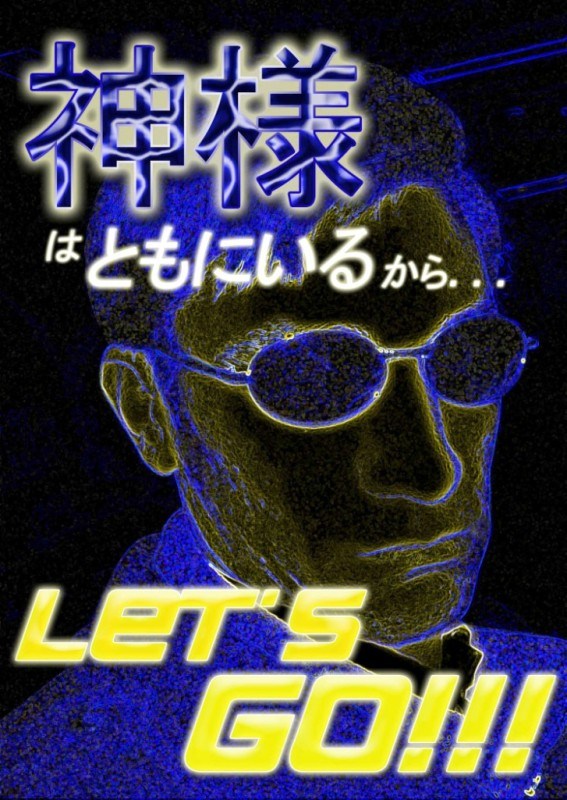 Ok, there’s a story behind this one that you need to know before I tell you what this says. It all started in Japanese Bible study. We were studying the Old Testament story about the 12 Hebrew spies that go over into the promised land. As you probably know, 10 of them come back doubtful that they’ll be able to enter the land because the people there are too powerful, but two of them (Joshua and Caleb) said, ” Let us go up at once and occupy it, for we are well able to overcome it ” (Numbers 13:30). So Noriko (the Bible study leader), in an effort to help us see how cool and courageous Joshua and Caleb were, imatated them by putting her fist in the air, looking intense, and saying (in Japanese and English), “God is with us, so LET’S GO!!!” Well, I thought that was the coolest catchphrase ever, so in an effort to make it so, I created this image. I love how the big chinese characters at the top (which say “God”, by the way) glow as if there was lightning rippling around inside of them. And that guy in the image, well… Just pretend he’s Caleb or Joshua or somebody who has that kind of faith. 🙂 So remember: Kami-sama wa tomo ni iru kara, LET’S GO!!!