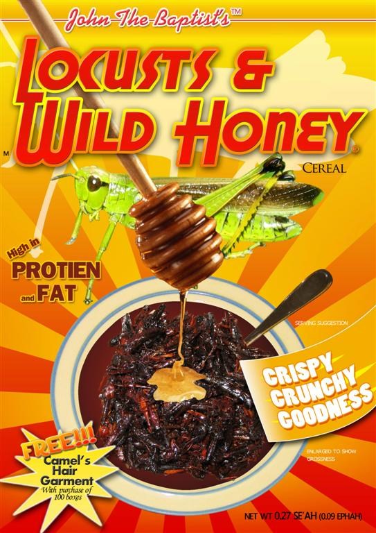 This last one, though, is just for laughs–certainly no deep meaning here! The idea for a ‘Locusts and Wild Honey’ cereal came, oddly enough, while sitting around drinking coffee after church one Sunday. I don’t know how the subject of John the Baptist came up, and I certainly don’t know how we got the idea for a cereal box. But the idea grew on me, and I just couldn’t help thinking that not only have I actually eaten locusts in Japan, I still have the pictures on my computer. So I had no excuse–I HAD to create this image. I had a lot of fun adding all the little details, from the net weight (given in se’ahs and ephahs) to the “Free Camel’s Hair Garment’ offer (only 100 boxes! What a steal!) So anyway, in case you needed more proof that ol’ Mike is cracked, here it is. Actually, I’ll bet this cereal would be better for you than most of the super-sugary American kids’ cereals on the market today! You know, the ones that give you an insulin headache and make your milk thick and syrupy and gross–Yuk!!! Now that ‘s disgusting!