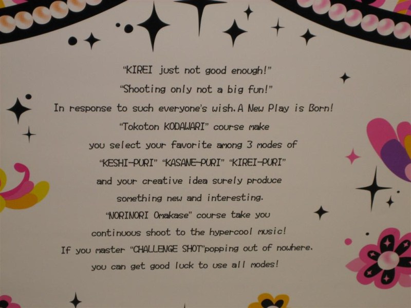 And now, the ultimate in barely comprehensible Engrish. We found this very creative and original text on the side of a Picture Club machine–one of those booths where you go in with your girlfriends and take a lot of pictures and then digitally alter them and print them out as stickers. It says,
