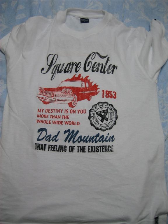 “Square Center .” “My destiny is on you, more than the whole wide world.” “Dad Mountain.” “That Feeling Of The Existence.” [Picture of flaming 1950’s Cadillac.] “College of the Wisconson, East Tenessee State.” Is this awesome or what? I still laugh every time I see this shirt. 10 bucks to anyone who can actually interpret this crazy jumble for me.
