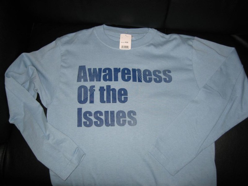 “Awareness of the Issues.” At last, a shirt that touts one of my main goals in life in big, bold letters. Have you got it?