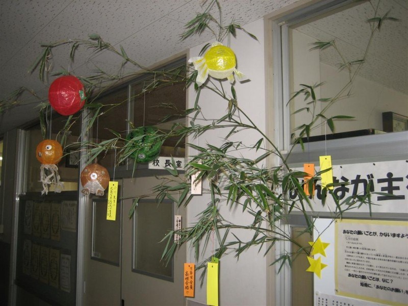 ( One of the Tanabata displays in Takine Junior High School with wishes written by the students and staff )