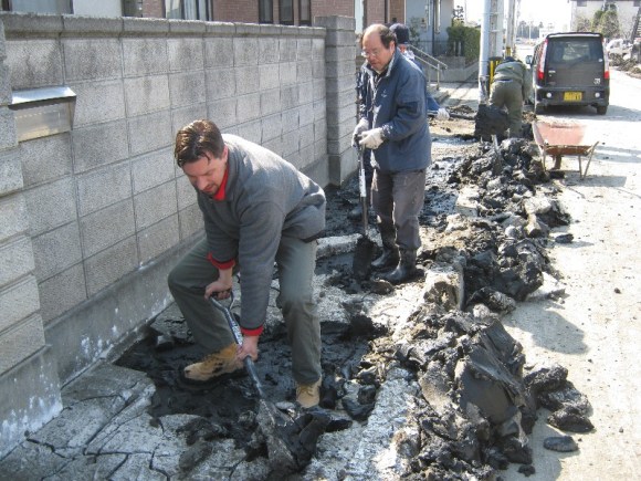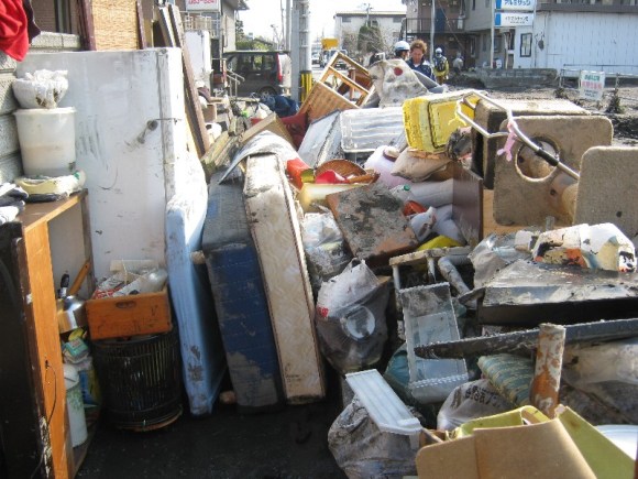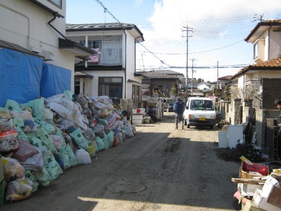 My experience there was difficult on a number of levels. We helped an elderly couple to move large items out of their damaged house–refrigerator, piano, etc. It felt painful to enter their once-beautiful Japanese home with dirty work boots on, and equally painful to help them take their largest and most expensive possessions out to the street to simply be trashed. We helped another elderly couple to empty their single-story house of their large items as well, and when we asked them if they wanted us to remove their tatami mats, the woman said that there was no need because they were just going to have to tear the whole thing down anyway. I kept asking myself, What if this were my house? What if I was this person? What would I be feeling? I couldn’t come up with an answer.