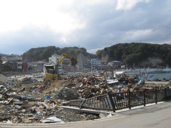 Today was the most blessed day of all, hands-down. We drove to a town about an hour south of Iwaki, and delivered water and toilet paper to some local residents. While we were there we saw some of the tsunami damage first-hand. Compared to other places it was fairly light, but there was still a huge pile of scrap that was being sorted on the beach: